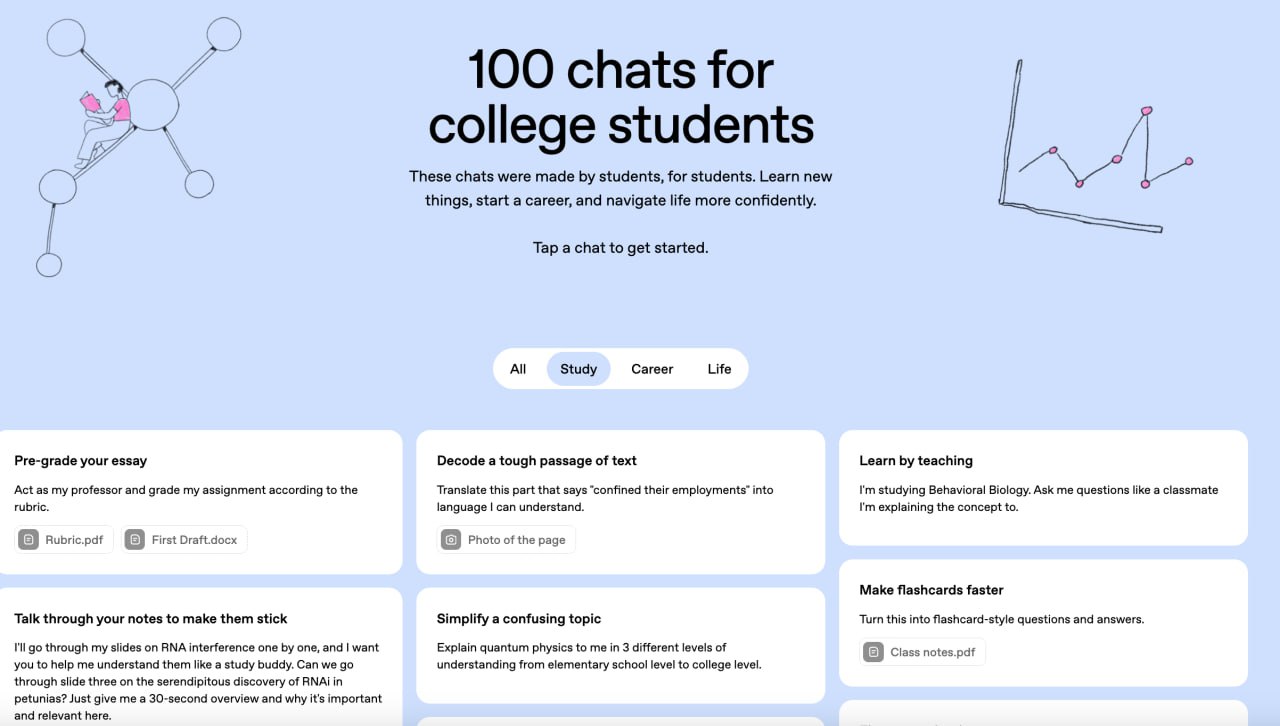 Студенты, это вам: OpenAI выпустили подборку из 100 промов для обучения, повседневной жизни и будущей карьеры