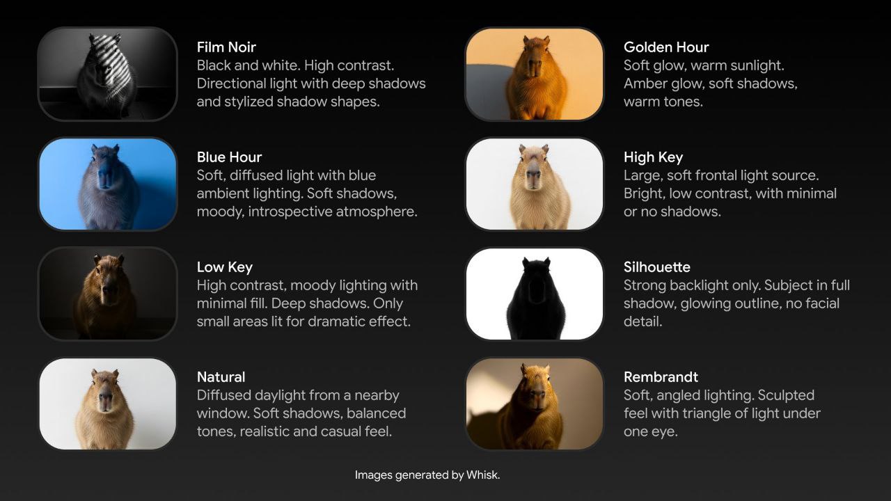 Крутая шпаргалка от Google — на капибарах объясняют, как напромтить правильно освещение для генератора картинок/видео