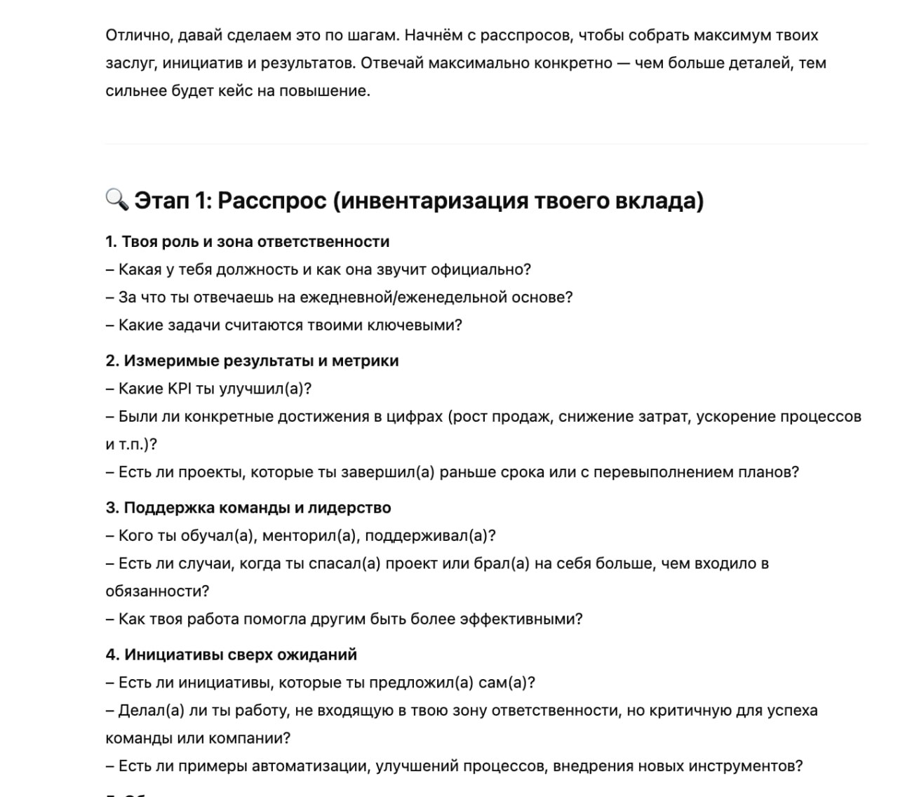 Логика простая: ChatGPT расспросит вас о ваших достижениях и поможет сформулировать сильные и аргументированные тезисы, чтобы получить больше $$$.